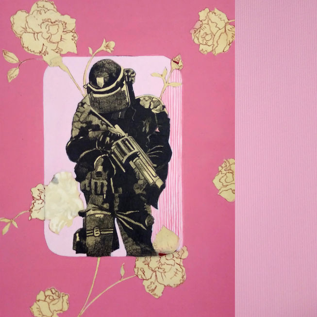 La fleur s’oppose, voir s’impose, aux corps en violences. En 2019, contexte social oblige, elle poursuit la série, y intégrant d’autres éléments floraux ou décoratifs (motifs de tapisserie).