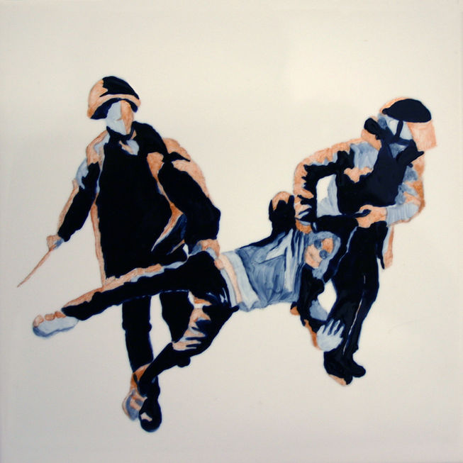 Dans cette série, anne saligan met en scène des violences policières lors de manifestations. L’image figée accentue les tensions des corps ; l’incartade pourrait être danse, elle devient motif : les casqués se lient à ceux qu’ils maintiennent.
